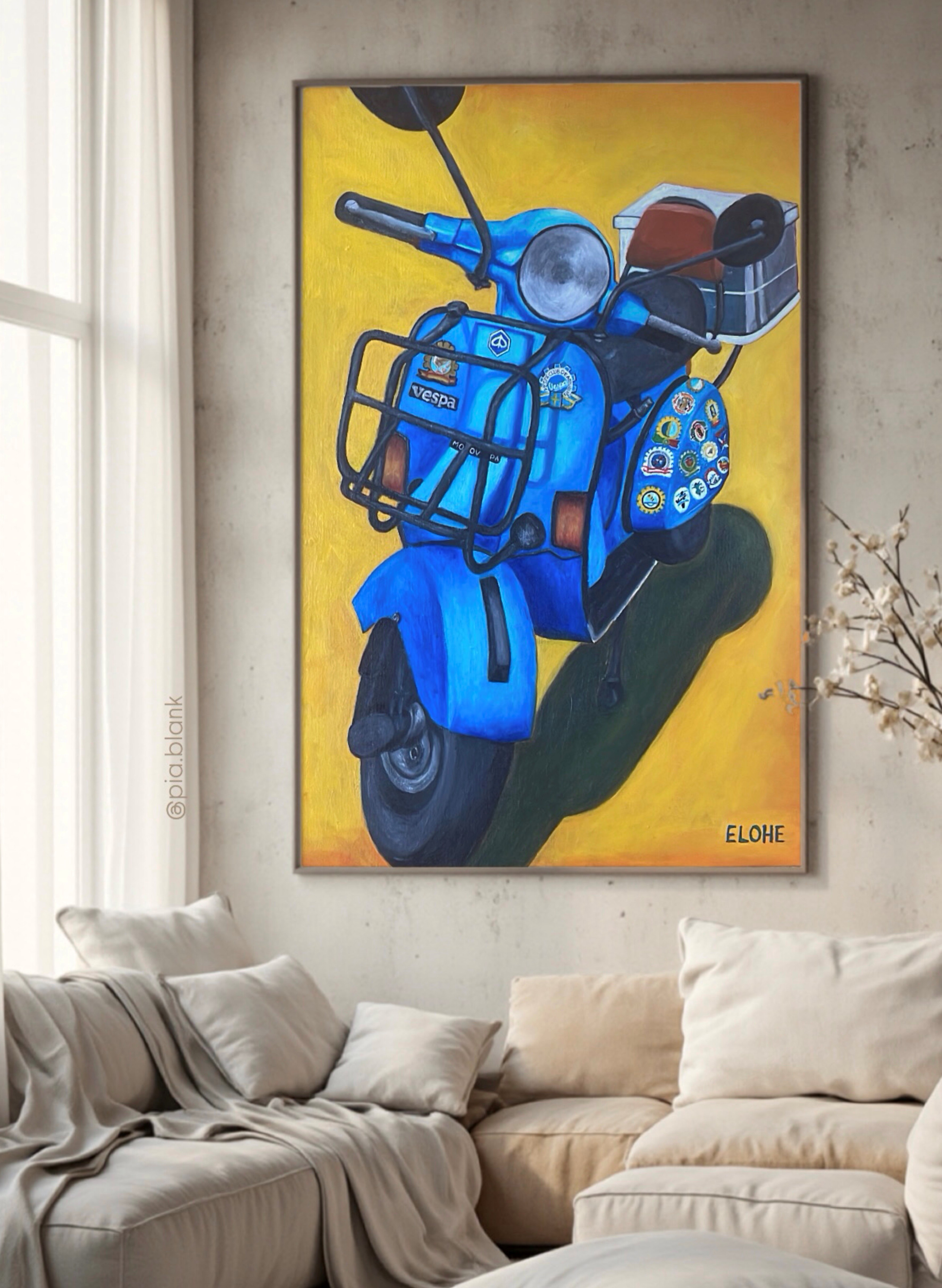 Una obra que celebra el alma retro de la Vespa, transformando un icono del motor en arte pop lleno de emoción y personalidad.