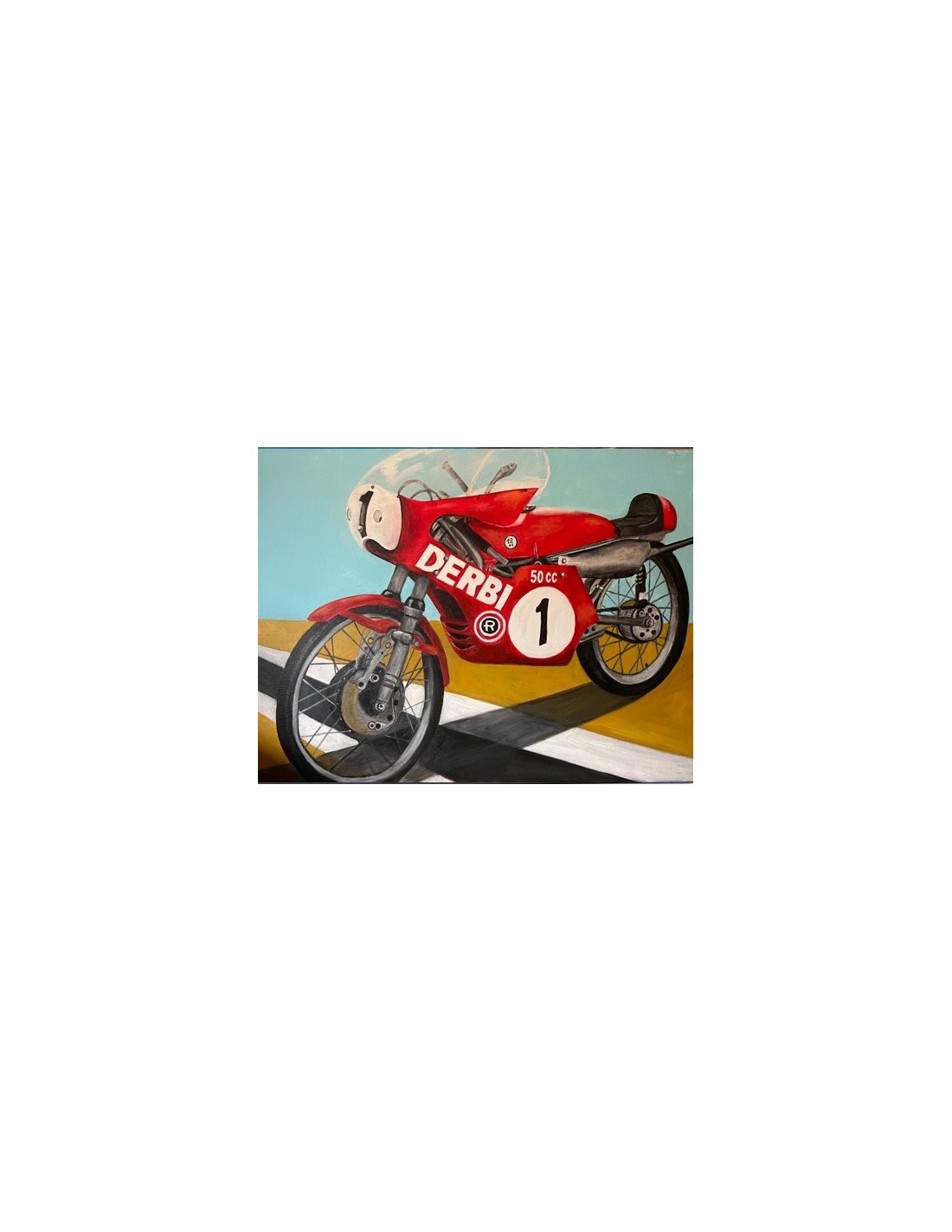 Esta lámina se inspira en la obra original "Derbi 50cc" de la Colección ´Motor Clásico´, un homenaje a los vehículos icónicos del siglo XX reinterpretados en clave pop contemporáneo.Con un estilo vibrante y lleno de color, la artista transforma el modelo Derbi en un símbolo de nostalgia, libertad y cultura visual, aportando frescura y dinamismo al arte actual.