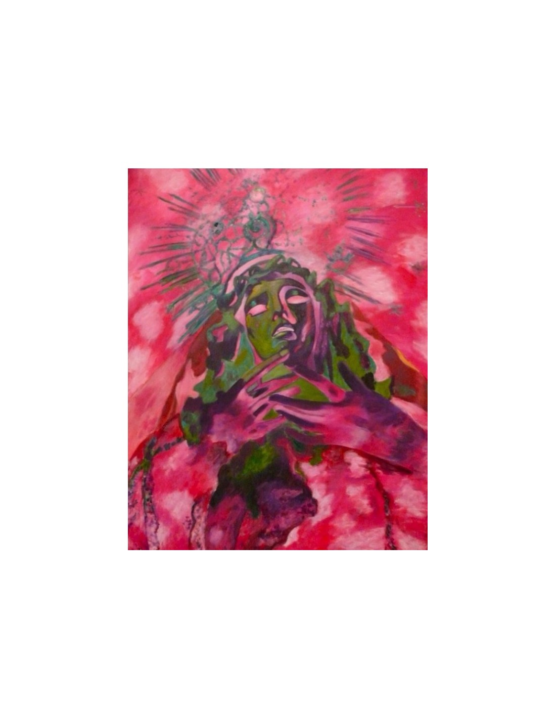 Una figura sagrada reinterpretada en tonos fucsia y verdes intensos. La obra mezcla espiritualidad, modernidad y un aura de misterio.